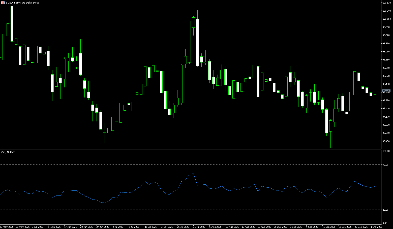 The US dollar index struggled to capitalize on its rebound from a one-week low, trading in a narrow range during Thursday's Asian session. However, it edged up to around 97.86, snapping a four-day decline as weak US jobs data and the government shutdown heightened expectations of a Federal Reserve rate cut. The index appears vulnerable to dovish Fed expectations. Traders have begun pricing in the possibility of two more rate cuts from the Fed in October and December, a bet confirmed by Wednesday's disappointing US private sector payroll data. Separately, the Institute for Supply Management's Purchasing Managers' Index (PMI) slightly exceeded consensus expectations, improving to 49.1 from 48.7 in September. However, this still indicates a seventh consecutive month of contraction in manufacturing business activity, failing to attract any follow-through buying for the dollar. Concerns that a prolonged US government shutdown could negatively impact economic performance are acting as headwinds for the dollar.