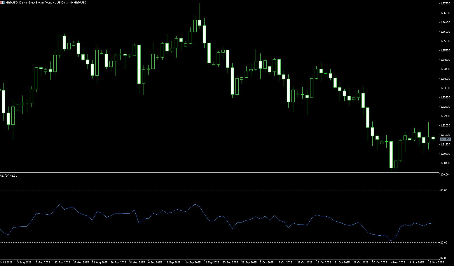 The pound/dollar continues to trade below the 30-day and 50-day simple moving averages (1.3241 and 1.3341), keeping the overall trend defensive. Recent candlesticks show a pause after the sharp drop in October, with the pair holding above the early November lows near 1.3010 and the psychological level of 1.3000. The latest trading session shows tight trading around 1.3050-1.3060, with neither buyers nor sellers showing confidence. The 14-day Relative Strength Index (RSI) has risen from oversold territory but remains below the midpoint, suggesting a mild recovery rather than a change in direction. The Stochastic Oscillator has crossed upwards but remains in the middle of its range, consistent with the current sideways movement. The pair is stabilizing after a sharp drop, with upside targets at the 1.3200 psychological level and the 1.3215 (last week's high) area, and downside targets at 1.3046 (November 6 low), 1.3010 (November 4 low), and the 1.3000 (psychological level) area.