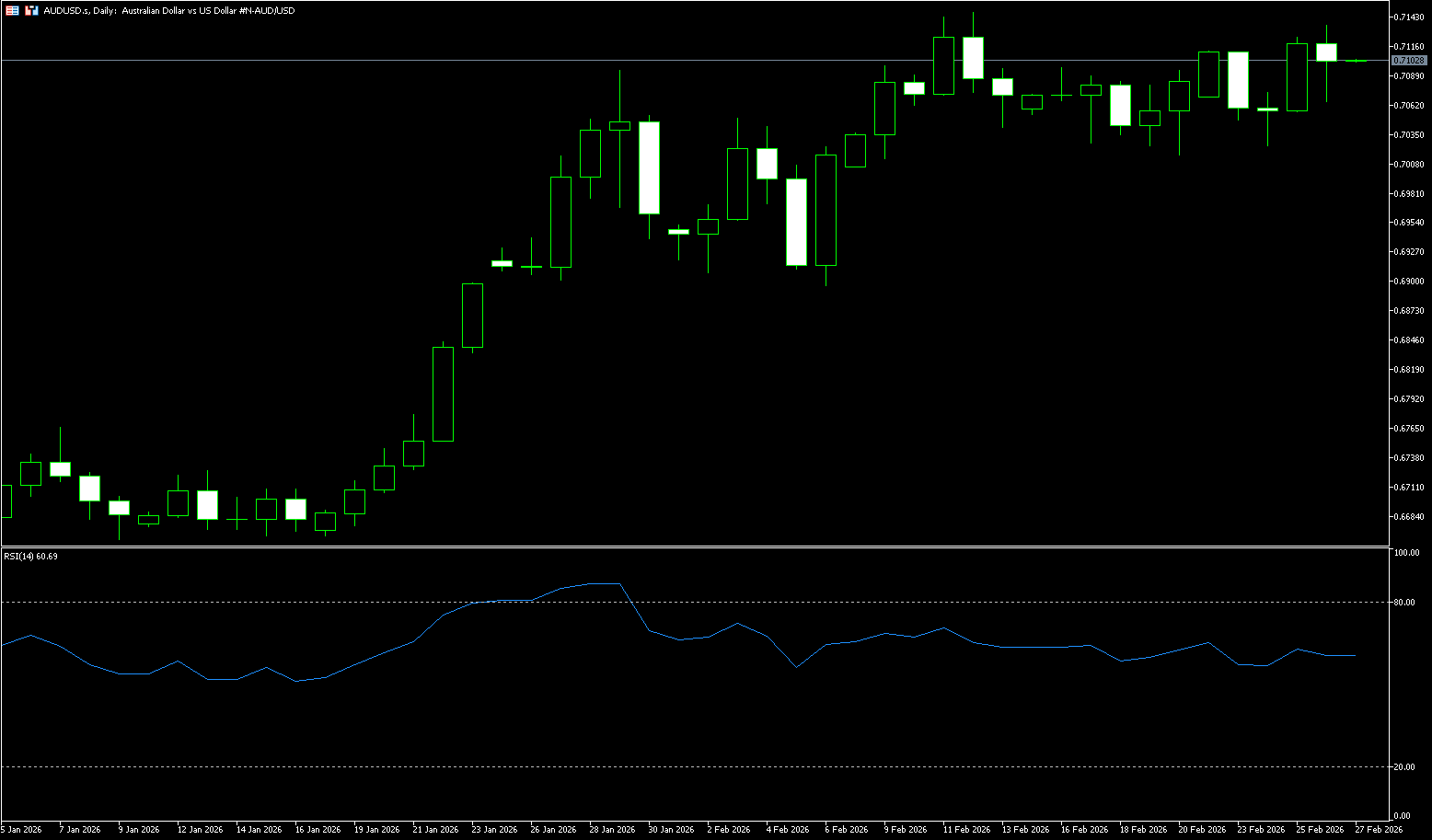 The Australian dollar rose to around $0.7130 on Thursday, reaching its highest level since early August 2022, as market expectations for another interest rate hike increased. The market anticipates an approximately 80% probability that the Reserve Bank of Australia will raise its 3.85% cash rate in May following an unexpected rise in inflation in January. The market also expects a total of about 40 basis points of rate hikes this year, although many analysts believe the terminal rate is close to 4.10%, roughly the peak reached during the post-pandemic inflation surge. Meanwhile, the likelihood of a rate hike in March appears less likely, as policymakers will not receive the full first-quarter inflation report until the end of April. Reserve Bank of Australia Governor Michelle Bullock reiterated that policy patience is necessary given the economy is near equilibrium, which dampened expectations of an aggressive tightening cycle. Focus now shifts to the final readings of next week's manufacturing PMI and GDP data for further clues about the country's economic momentum.