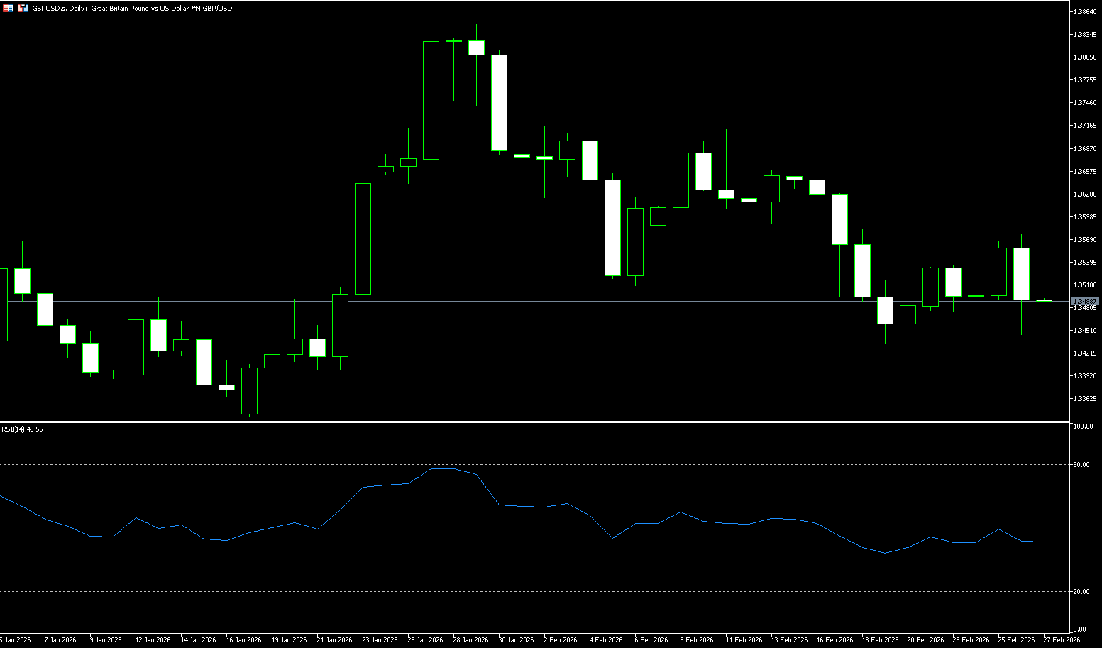 GBP/USD is trading around 1.3485. The currency pair is consolidating around 1.3500, limiting directional confidence. After a pullback from mid-month highs, the pair has stabilized, with the latest candlesticks clustered near the moving averages, indicating consolidation rather than a clear trend continuation. The 14-day Relative Strength Index (RSI) shows neutral momentum in the 45.00-50.00 range, reinforcing the sideways movement. Initial support is seen at the February 19 low of 1.3434, the recent low; failure to hold this level could lead to a move towards the 1.3400 level (psychological support) and the low of 1.3344. On the upside, a break above 1.3591 (20-day moving average) and the 1.3600 (psychological support) area could lead to a retest of the February 16 high of 1.3662.