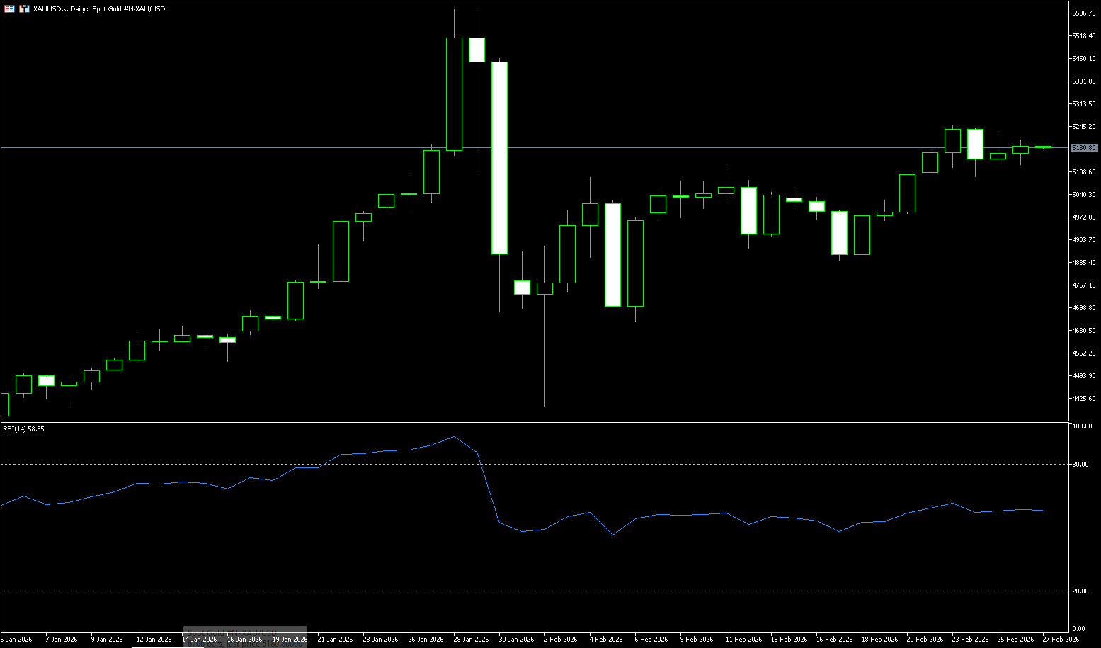 In early Asian trading on Thursday, spot gold traded around $5,185 per ounce. Gold prices climbed on Wednesday as inflationary pressures from US tariffs and geopolitical tensions ahead of the Iran nuclear talks stimulated safe-haven demand. Uncertainty surrounding US domestic policy provided upward momentum for gold. The US Supreme Court rejected the administration's ruling to impose additional tariffs, finding that Trump's invocation of emergency economic powers to advance the tariff agenda exceeded his authority and directly overturned the existing trade policy framework. Although Trump immediately announced a 10% tariff on global trade and hinted at a possible increase to 15%, while threatening higher tariffs on countries that violated trade agreements, the market remains concerned that countries will use this opportunity to demand revisions to existing agreements. Expectations of global trade contraction continue to suppress market risk appetite, further enhancing the allocation value of gold. Supported by both geopolitical conflict and policy uncertainty, gold, with its scarcity and safe-haven attributes, has become the optimal choice for global funds seeking refuge. Gold price momentum has cooled somewhat from overbought territory, but the 14-day Relative Strength Index (RSI) remains stable above its midline, suggesting that upward pressure persists rather than foreshadowing a deeper pullback. The Moving Average Convergence Divergence (MACD) has retreated from recent highs and is trending flat, with the negative histogram contracting, indicating that the market is in a consolidation phase within an overall bullish structure, rather than having completed a top formation. On the upside, initial resistance lies near the recent rally high of $5249.80; a break above this level would open the way to the next bullish target of $5300.00 (a psychological level) and the 76.4% Fibonacci retracement level of $5311.20. As long as gold prices hold above the initial support of $5100, any pullback is likely to be viewed as a correction within the current uptrend. On the downside, initial support appears around the $5,100 level. A break below $5,100 would expose deeper support around the psychological $5,050-$5,000 level.