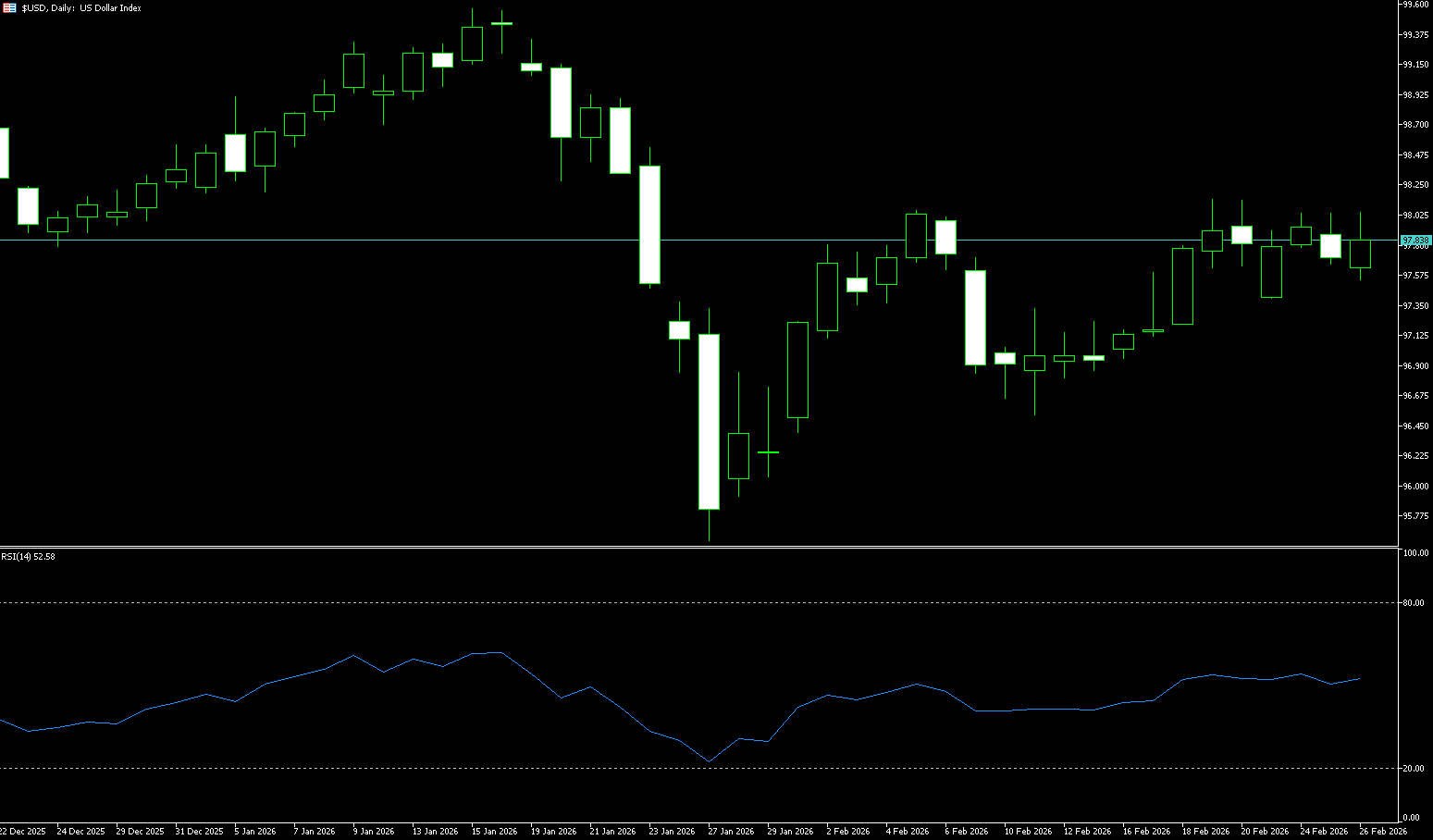 The US dollar index edged lower on Thursday, closing at 97.75, hovering near a one-month high reached last week. Investors continued to await new catalysts, and uncertainty remained despite some easing concerns about President Trump's trade policies. Sentiment was also weighed down by worries related to US-Iran negotiations. Meanwhile, both initial and continuing jobless claims were lower than expected, indicating that the US labor market has stabilized and employers are continuing to retain staff. At the same time, the money market has lowered its expectations for a Federal Reserve rate cut. The probability of a 25 basis point rate cut by June has fallen to 50%, the lowest level this year, while expectations for a third rate cut by the end of the year have almost disappeared.