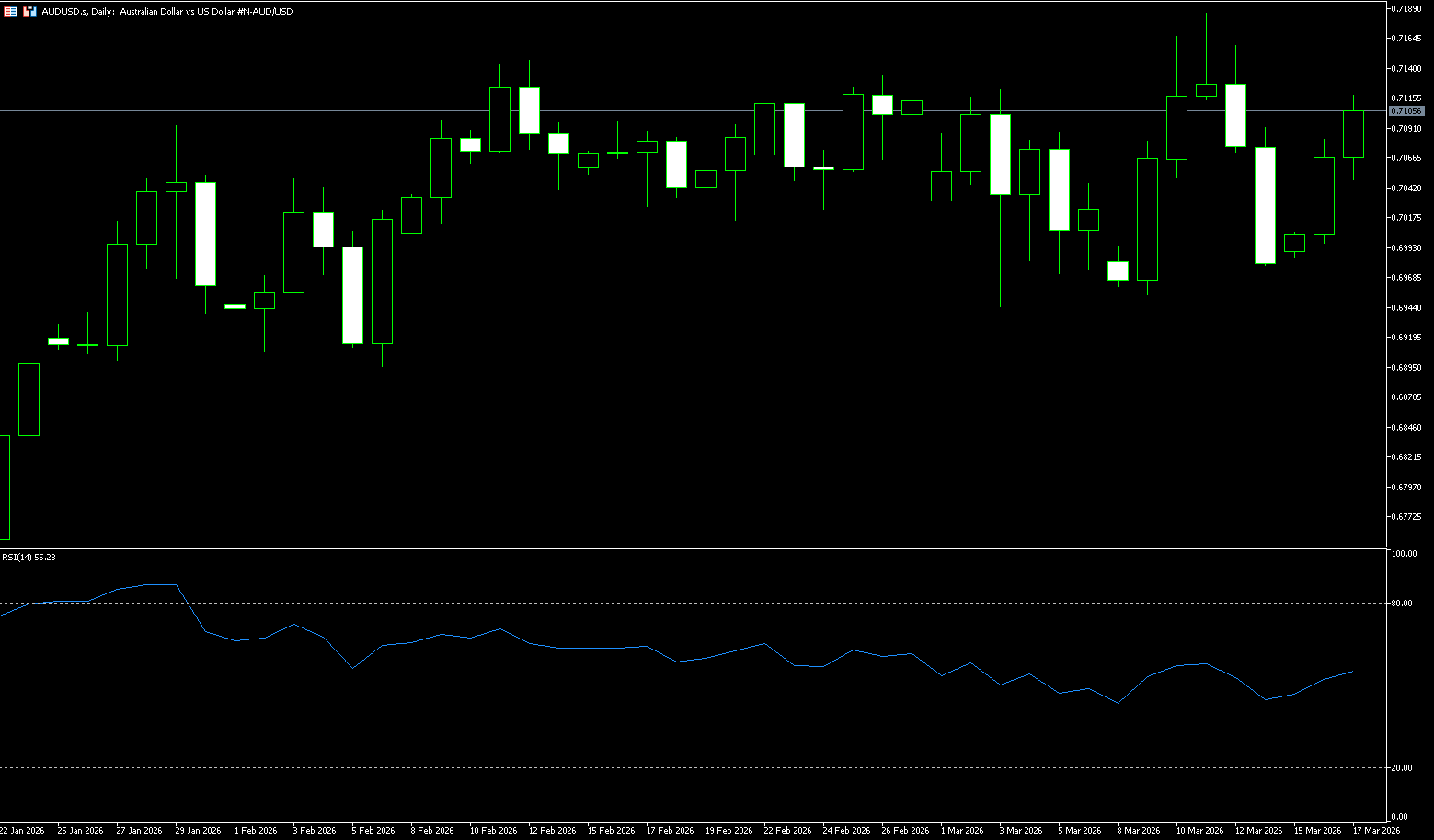 On the daily chart, the short-term bias for the Australian dollar against the US dollar is slightly bullish, as the price remains above the rising 50-day simple moving average at 0.6969 and is consolidating below recent highs. Daily closing prices clustered in the upper half of the Bollinger Bands, and the band has flattened, suggesting continued but weakening upward momentum rather than a sell-off top. The Relative Strength Index (RSI) has retreated from overbought territory above 70 to around 52, indicating that bullish pressure remains, but the upward acceleration has weakened after the surge at the beginning of the month. Immediate support is at 0.7000 (a psychological level), followed by the 50-day simple moving average at 0.6969. On the upside, initial resistance is at 0.7150, then the 0.7200 (a psychological level).