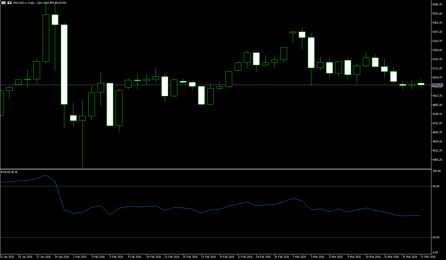 The short-term trend is slightly bullish, with prices stabilizing above the 50-day simple moving average, near 4,965, and comfortably above the 100-day and 200-day simple moving averages. The 20-day simple moving average has flattened out near 5,125 but remains above spot, suggesting a shallow consolidation within a broader uptrend rather than a full reversal. The Relative Strength Index (RSI) is around 47.54, still close to the neutral midline, indicating weakening momentum but no clear shift to sellers. Immediate support is seen at the key support level of $5,040, but a further test of the $4,965 (50-day moving average) should be anticipated, potentially leading to a short-term pullback to the $4,900 psychological level. If gold can effectively break through the $5,100 resistance level, the next target will likely be $5,200.