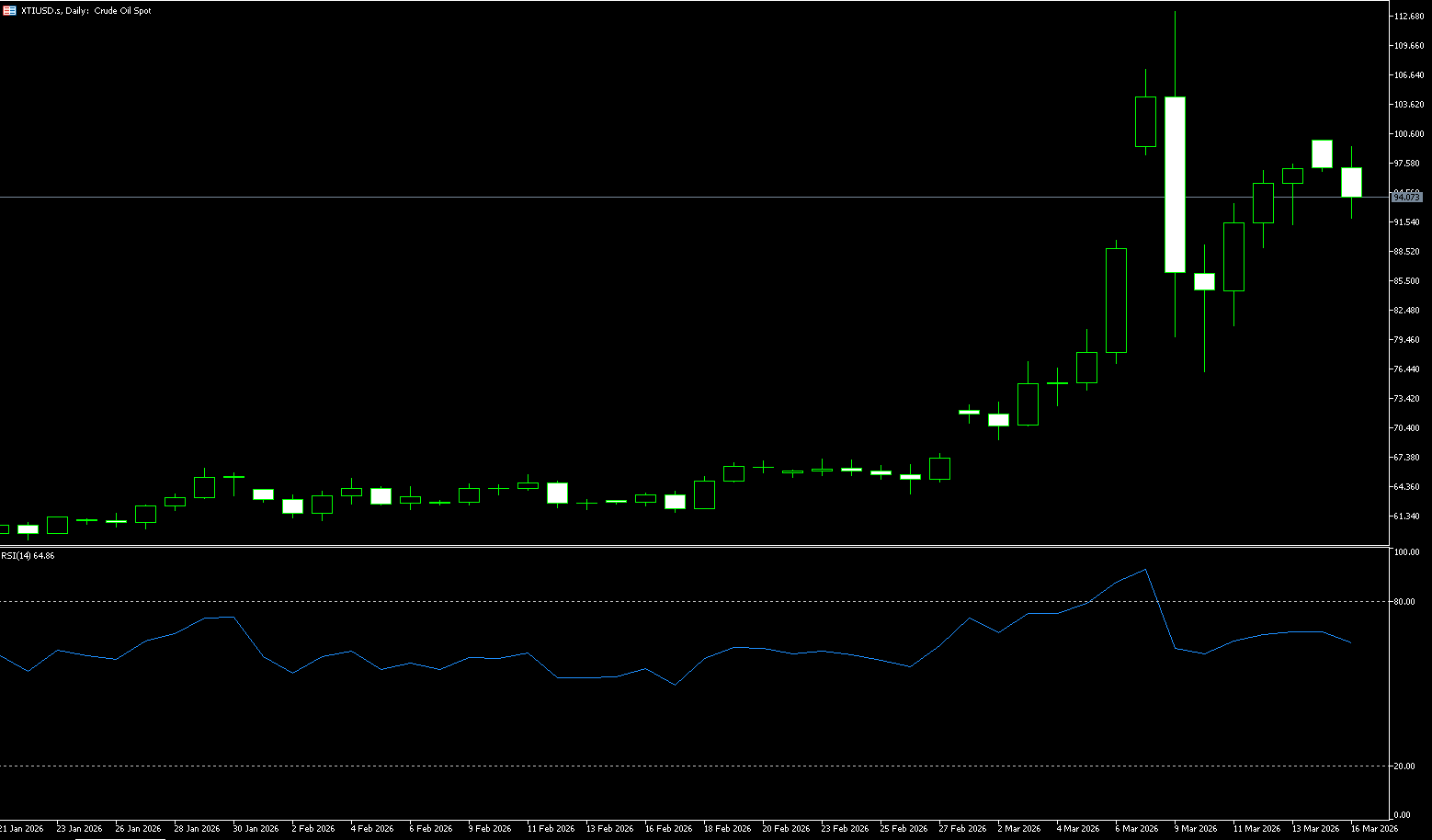 This week, the market saw a significant pullback. As of the latest data on March 17th, WTI crude oil settled around $94 per barrel, a drop of about 5%-6% from its previous high. This decline is not a signal of risk abating, but rather the result of multiple short-term factors: after several weeks of continuous gains, profit-taking pressure from long positions has increased. For crude oil trading, the real-time development of geopolitical events has become a key variable influencing short-term decisions, and the progress of channel repair will directly determine the pace of market risk appetite shifts. Technically, WTI crude oil has broken through the key $90-$95 level. The next major resistance is currently at $99.91 (the high at the beginning of the week) and around $100.00 (a key psychological level), which are the next stage of resistance levels. A break below these levels would revisit the previous high of $113.28. On the downside, watch for $91.90 (Monday's low) and the $90.00 (a psychological level).