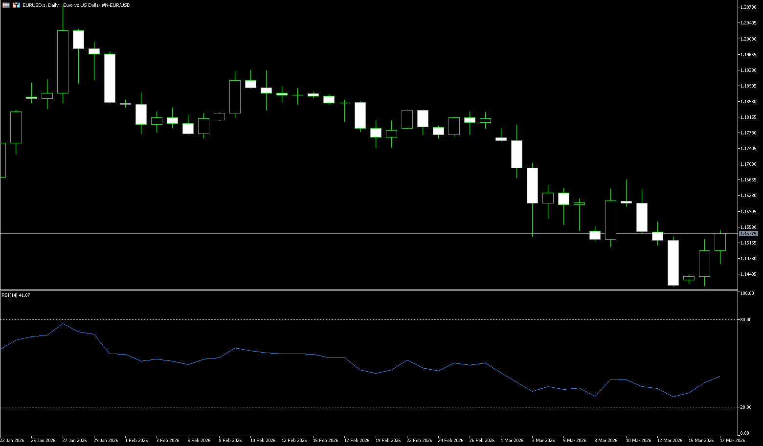 The short-term bias is slightly bearish, as EUR/USD is holding below the 10-day (1.1560) and 20-day (1.1662) simple moving averages on the daily chart, both of which slope downwards, reinforcing the downtrend. The Relative Strength Index (RSI) hovers around 36.20, indicating weak momentum, consistent with a corrective downtrend rather than an oversold sell-off. Immediate resistance is at 1.1560, within the 1.1550-1.1565 area, which coincides with the 50-period simple moving average and the lower Bollinger Band. Next is the 20-day simple moving average at 1.1662. On the downside, initial support is at 1.1450, protecting the recent lows; a significant break below this level would expose the area below 1.1414 (the March 16 low), consistent with the bearish bias suggested by the broader moving average configuration.