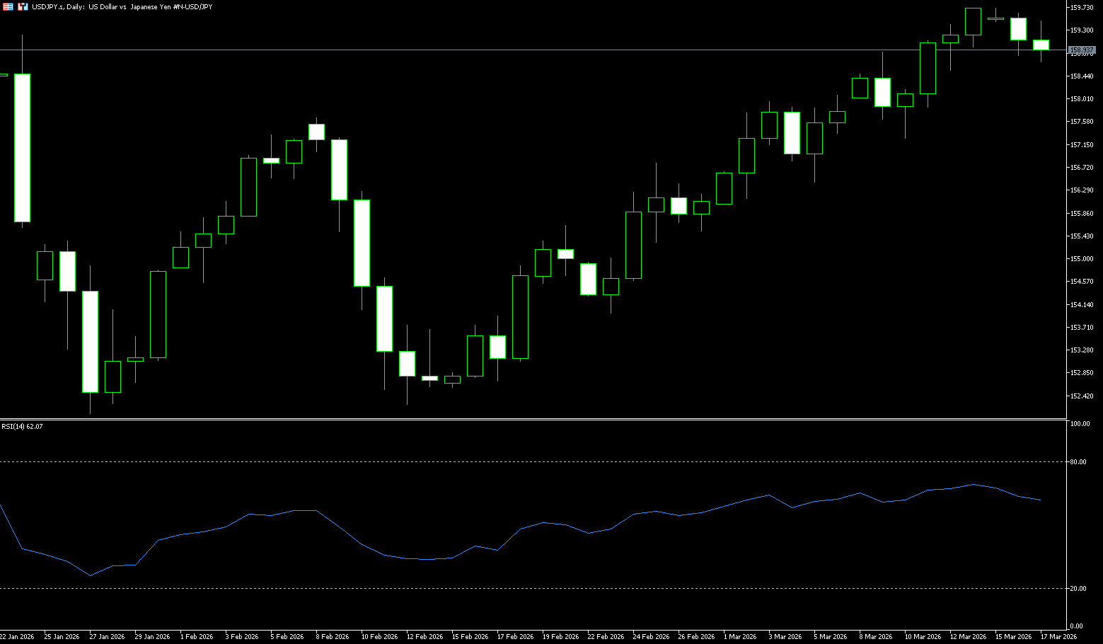 The yen gave back gains from the previous session before falling to near 159.00 per dollar on Tuesday, as verbal intervention by authorities has so far failed to halt the currency's decline. Finance Minister Satsumi Katayama stated that recent currency volatility does not reflect fundamentals and reiterated warnings that authorities might take action to defend the yen. She added that they are prepared to respond at any time, given the impact of rising exchange rates and oil prices on daily life. Meanwhile, Bank of Japan Governor Kazuo Ueda stated that underlying inflation is gradually moving towards the 2% target. Amid heightened uncertainty about the domestic economic impact of the war with Iran, markets widely expect the central bank to keep interest rates unchanged this week. Japan has so far rejected US President Donald Trump's call to send warships to escort oil tankers through the Strait of Hormuz.