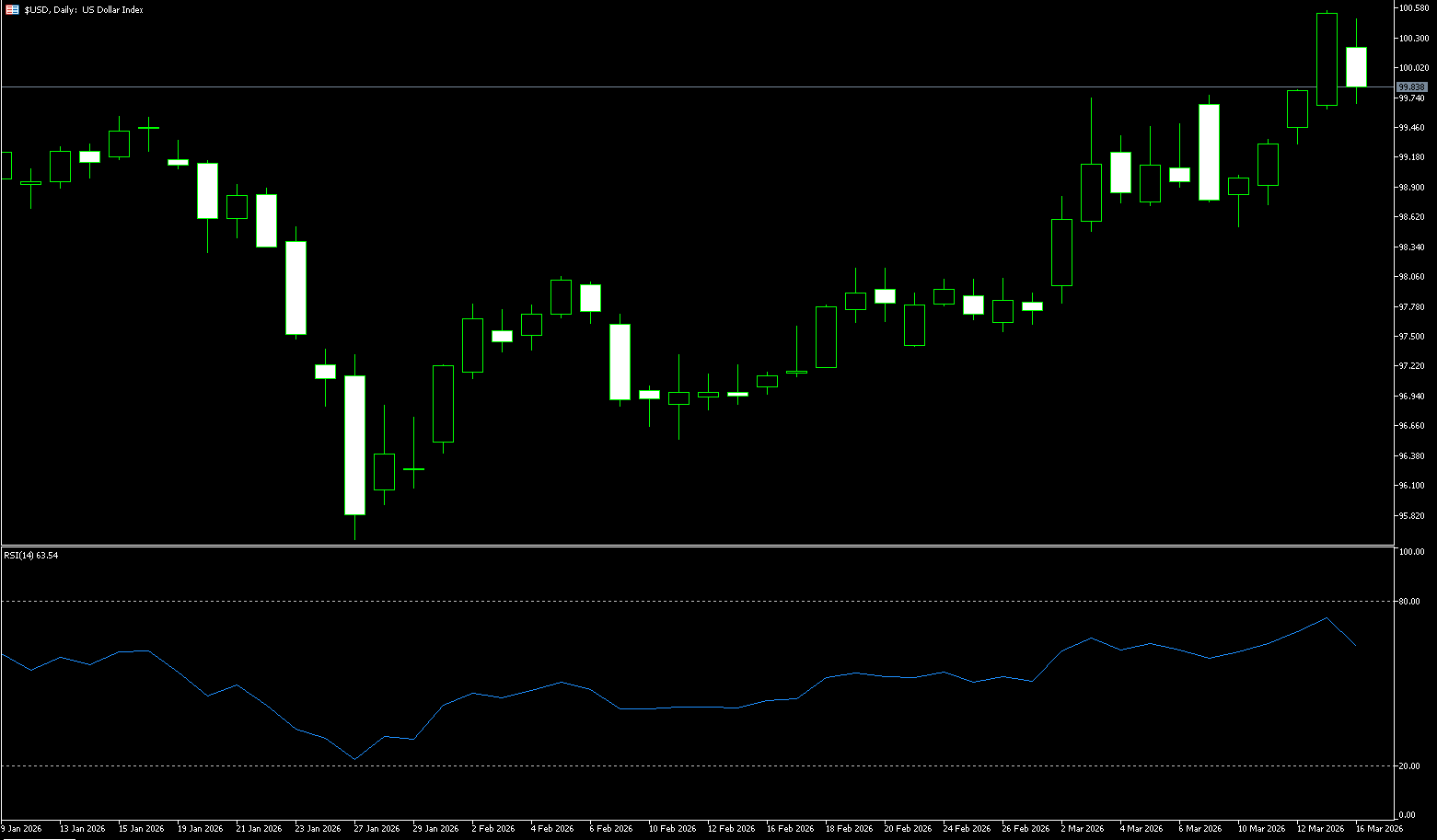The US dollar index held steady below 100 on Tuesday, after being pressured in the previous session, as investors continued to assess the impact of Middle East conflict and volatile oil prices on the economy and inflation. The dollar fell on Monday as several oil tankers safely passed through the Strait of Hormuz, with lower oil prices helping to ease inflation concerns. Treasury Secretary Scott Bessant also stated that the US allowed Iran to continue transporting crude oil through the Strait of Hormuz, and that President Donald Trump had asked other countries to support efforts to protect commercial activities along the waterway. Meanwhile, the market widely expects the Federal Reserve to keep interest rates unchanged on Wednesday as policymakers grapple with uncertainty surrounding the war with Iran. Investors will be closely watching central banks' assessments of the recent surge in energy prices and their impact on inflation and borrowing costs.