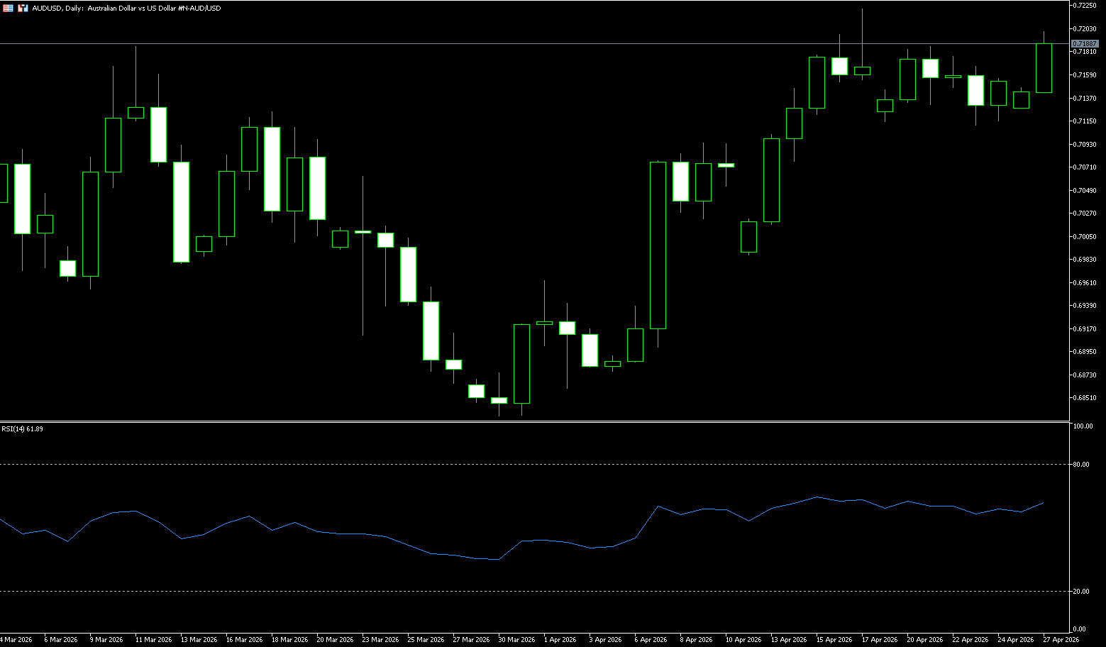 The Australian dollar rose above $0.7180, recovering from a loss of about 0.3% last week and holding near four-year highs, as soaring energy prices strengthened expectations of an interest rate hike ahead of upcoming inflation data. Despite a largely sustained ceasefire since early April, efforts to resume peace talks between the US and Iran have stalled, and energy flows through the Strait of Hormuz remain restricted. The resulting energy supply shock continues to exacerbate inflation risks, reinforcing market expectations that the central bank will maintain higher interest rates for longer or raise them further. In Australia, investors are awaiting the March Consumer Price Index report on Wednesday, which is expected to show overall inflation rising 4.7% year-on-year, well above the Reserve Bank of Australia's 2-3% target. Any unexpected upside surprise could solidify market bets on a 25 basis point rate hike at the central bank's May 5 meeting. The market currently estimates an 80% probability of a third rate hike this year to 4.35%.