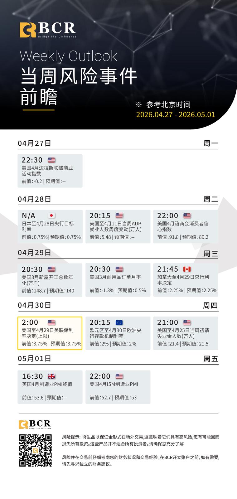 風險披露:衍生品在場外交易,採用保證金交易,意味著具有高風險水平,有可能會損失所有投資。這些產品並不適合所有投資者。在進行交易之前,請確保您充分了解風險,並仔細考慮您的財務狀況和交易經驗。如有必要,請在與BCR開設帳戶之前諮詢獨立的財務顧問。