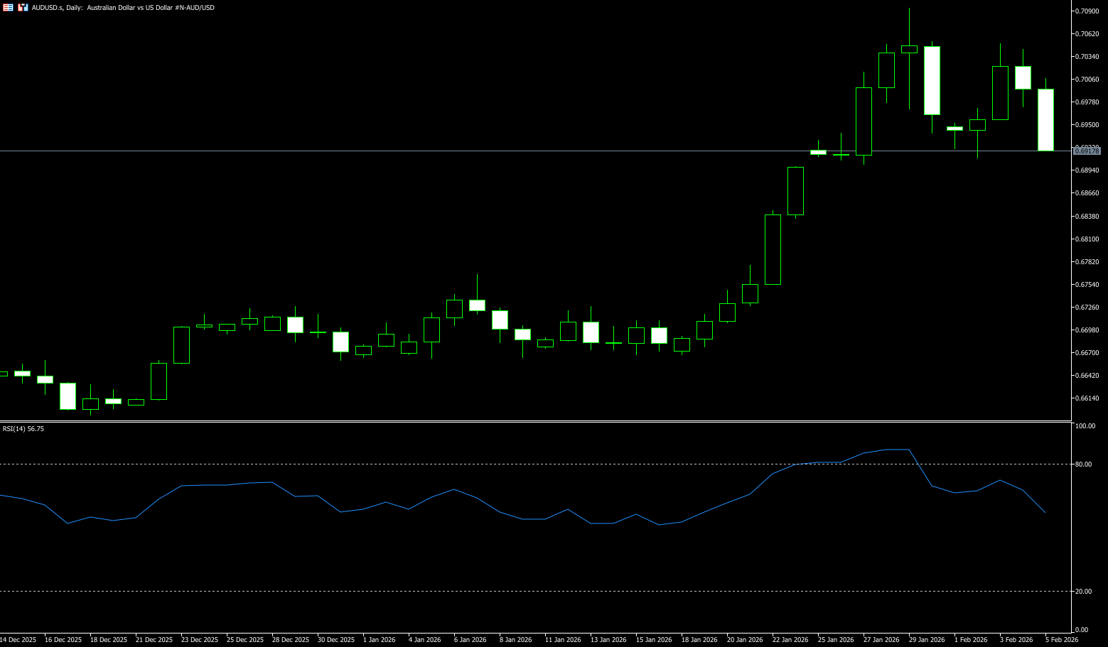 Cặp đô la Úc/đô la Mỹ giao dịch yếu hơn một chút vào thứ Năm. Cặp tiền này mất điểm khi kỳ vọng thị trường về chính sách của Fed thay đổi sau khi Tổng thống Mỹ Donald Trump đề cử cựu Thống đốc Fed Kevin Warsh làm Chủ tịch Fed vào tuần trước, dẫn đến đồng đô la Mỹ mạnh hơn. Nếu dữ liệu tốt hơn mong đợi, đồng đô la Úc có thể tăng, với mức kháng cự phía trên đầu tiên tại mức cao ngày 3 tháng 2 là 0.7050. Mức kháng cự tiếp theo là tại mức cao ngày 29 tháng 1 là 0.7094, với kháng cự xa hơn nhắm tới mức cao ngày 26 tháng 1 năm 2023 là 0.7142. Về phía giảm, mức thấp nhất ngày 3 tháng 2 tại 0.6900 sẽ cung cấp một số hỗ trợ cho phe mua. Các đợt giảm sâu hơn có thể dẫn đến việc rơi xuống mức thấp ngày 23 tháng 1 là 0.6834.