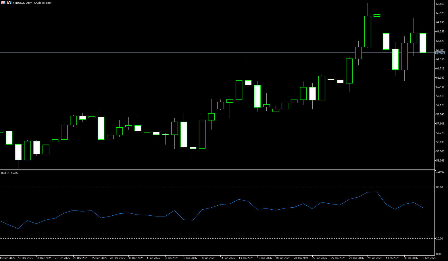 Từ góc độ biểu đồ hàng ngày, dầu thô WTI đã tìm thấy hỗ trợ đáng kể quanh mức $61 sau đợt giảm mạnh hồi đầu tuần, hình thành một đợt hồi phục khá điển hình. Giá đã leo trở lại trên mốc $64, cho thấy lực mua tại các mức thấp đã bắt đầu xuất hiện và áp lực bán ngắn hạn đã được giải tỏa phần nào. Từ góc độ kỹ thuật, WTI vẫn nằm trong một phạm vi giao dịch. Đợt giảm nhanh trước đó không phá vỡ cấu trúc phạm vi tổng thể, và vòng tăng điểm này thiên về một đợt điều chỉnh kỹ thuật hướng tới biên dưới của phạm vi. Vùng hiện tại từ $65.00 (mức tâm lý) đến $65.79 (dải trên Bollinger) cấu thành một vùng kháng cự đáng kể cho đợt hồi phục ngắn hạn. Vùng này vừa là khu vực tập trung giao dịch trước đó, vừa là vị trí then chốt nơi phe mua và phe bán đã nhiều lần đụng độ. Vùng từ $62.60 (mức thấp thứ Tư) đến $62.23 (đường trung bình động 14 ngày) tạo thành vùng hỗ trợ ngắn hạn quan trọng, tiếp theo là mức $61.41 (đường trung bình động 20 ngày).