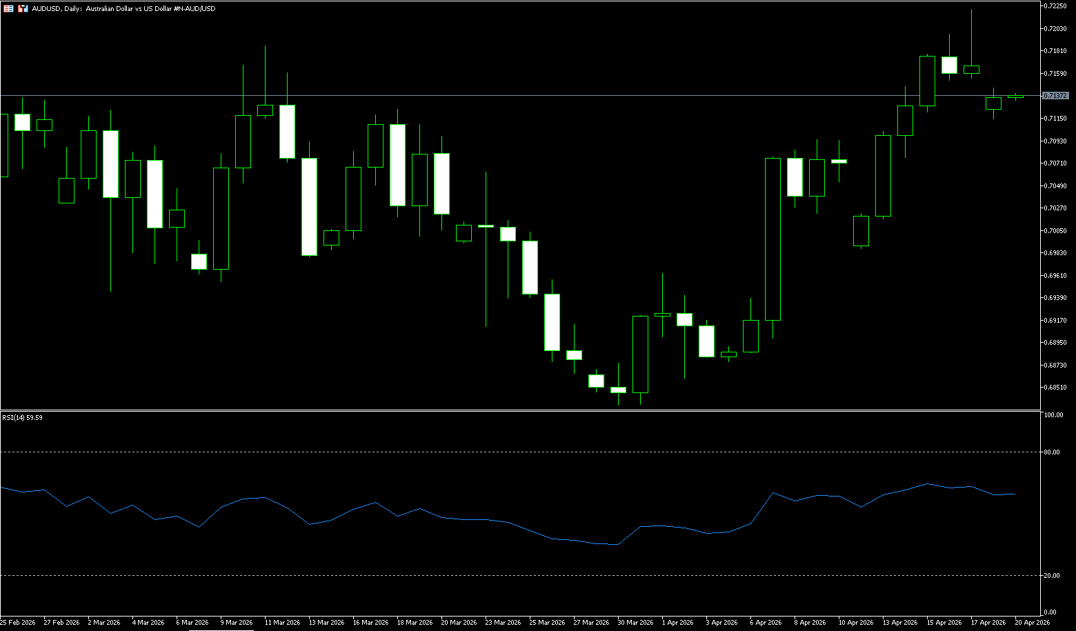 Đồng đô la Úc đã tạm dừng xu hướng tăng so với đô la Mỹ, tích lũy trên mức 0.7150 vào tuần trước do đồng đô la Mỹ mạnh hơn. Trong khi đó, lệnh ngừng bắn giữa Israel và Lebanon đã tiếp thêm hy vọng cho hòa bình ở Trung Đông. Điều này, kết hợp với kỳ vọng thị trường về việc Fed tăng lãi suất giảm xuống, có thể hạn chế đà tăng của đồng đô la và hỗ trợ cặp tiền giữa bối cảnh triển vọng diều hâu từ Ngân hàng Dự trữ Úc. Đồng đô la Úc đã giữ trên mức US$0.7100 vào tuần trước, gần mức cao nhất kể từ tháng 5 năm 2022, và nhìn chung đã tăng so với các cặp tiền tệ chính. Đô la Úc vượt trội hơn các đồng tiền khác khi tâm lý thị trường vẫn thuận lợi cho các tài sản rủi ro và hy vọng về một lệnh ngừng bắn vĩnh viễn giữa Mỹ và Iran vẫn mạnh mẽ. Nó đang trên đà ghi nhận tuần tăng điểm thứ ba liên tiếp, được thúc đẩy bởi tâm lý rủi ro cải thiện nhờ hy vọng về khả năng hạ nhiệt trong xung đột Trung Đông. Tổng thống Mỹ Trump tiếp tục ám chỉ về tiến triển của một thỏa thuận với Iran, nói thêm rằng Iran hiện sẵn sàng hơn trong việc từ bỏ tham vọng hạt nhân và bàn giao uranium đã làm giàu. Trong khi đó, không bên nào công bố thời gian biểu cho vòng đàm phán mới. Bất chấp các chi tiết then chốt chưa được xác nhận, Eo biển Hormuz tiếp tục đối mặt với những gián đoạn, dẫn đến biến động gia tăng trong giá năng lượng.