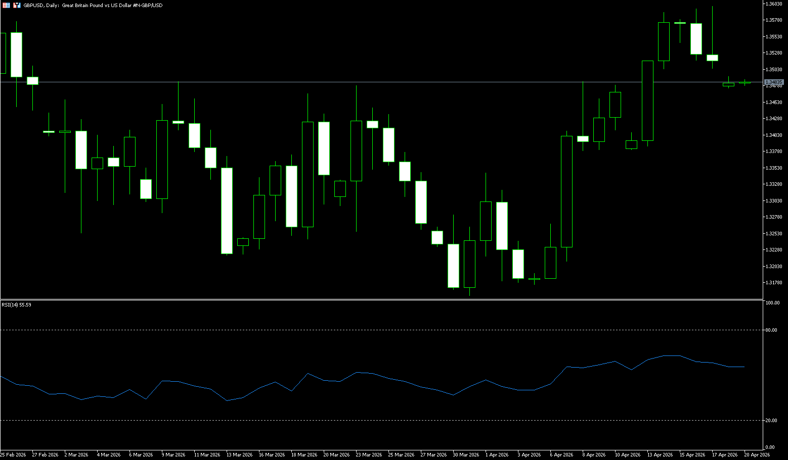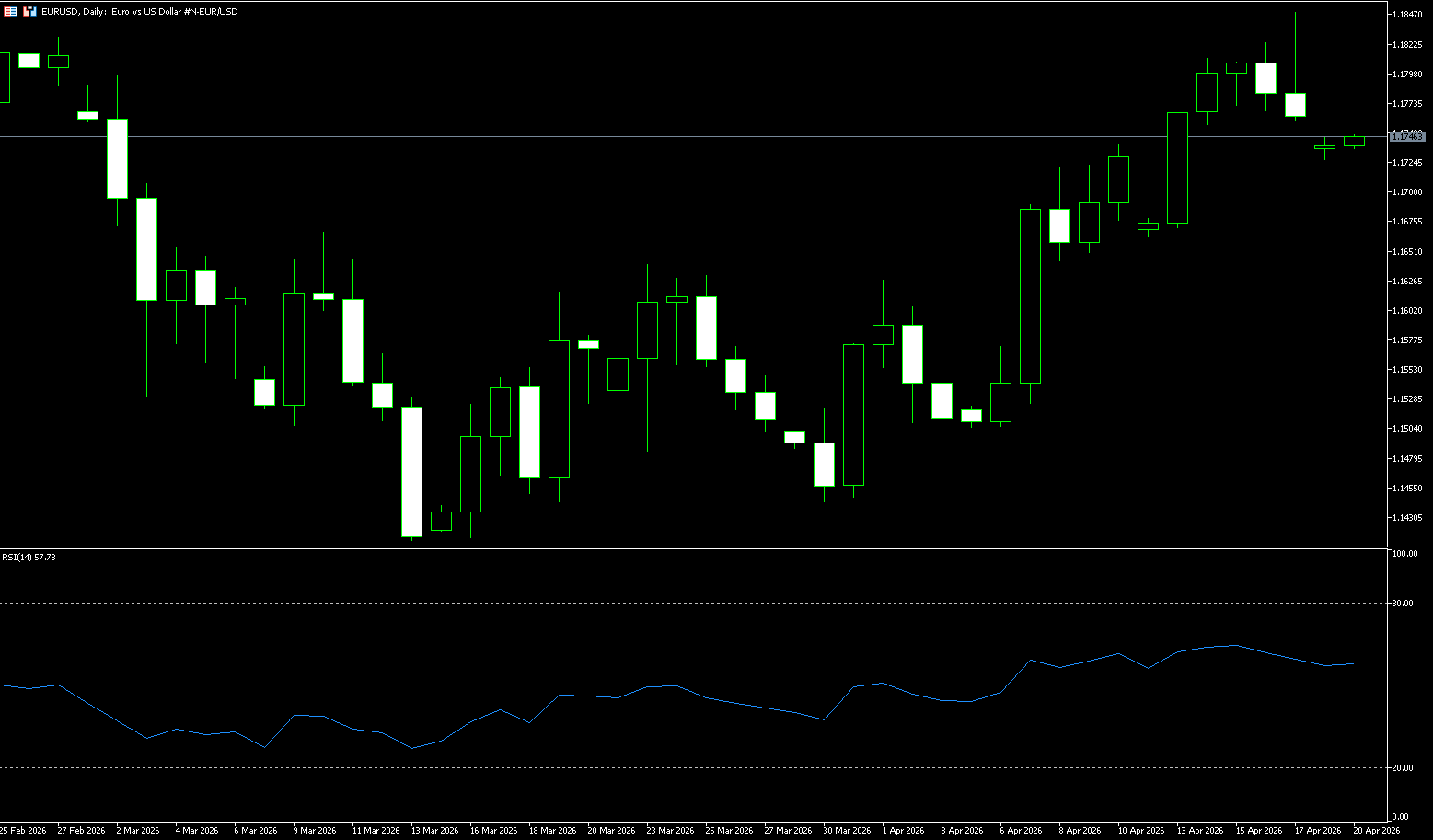 Thị trường đã giữ lập trường tích cực đối với đồng euro kể từ cuối tuần trước. Trong nhận định mới nhất cách đây hai ngày (ngày 15 tháng 4, giá hiện tại 1.1800), động lượng đi lên hiện tại của thị trường vẫn ở mức khiêm tốn. Tuy nhiên, đồng euro có thể tiếp tục tăng, nhưng liệu nó có thể chạm tới mức 1.1850 hay không vẫn còn phải chờ xem. Đồng euro đã tăng lên mức cao mới 1.1824 trước khi lùi bước. "Hành động giá hiện tại có khả năng là một phần của giai đoạn tích lũy. Đồng euro dự kiến sẽ giao dịch giữa 1.1760 và 1.1805 trước khi kết thúc tuần. Động lượng tăng đã yếu đi, nhưng chỉ một sự phá vỡ dưới 1.1735 mới chỉ ra rằng đồng euro không sẵn sàng cho các mức tăng xa hơn." Trong khi đó, tỷ giá euro/đô la đang giao dịch quanh mức 1.1800 lần đầu tiên kể từ tháng 2 năm ngoái, khi sự lạc quan đã làm giảm đáng kể nhu cầu đối với đô la. Các nhà đầu tư hoan nghênh tin tức rằng Mỹ và Iran sẽ quay lại bàn đàm phán tại Islamabad vào cuối tuần này hoặc đầu tuần tới, nghĩa là căng thẳng khó có thể leo thang, ít nhất là trong vài ngày tới.