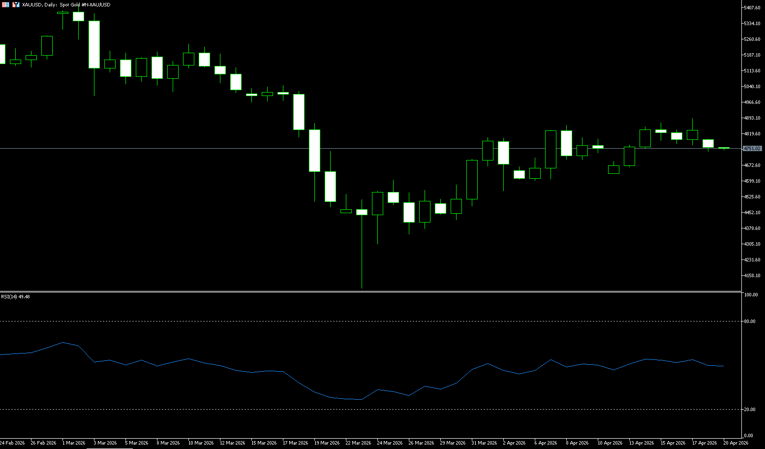 Lợi suất trái phiếu kho bạc Mỹ kỳ hạn 10 năm và chỉ số đô la Mỹ đã liên tục giảm kể từ đầu tháng 4, đây là môi trường kinh tế vĩ mô cần thiết để vàng tăng giá. Chi phí cơ hội của việc nắm giữ vàng không sinh lợi suất giảm khi lợi suất trái phiếu giảm, trong khi đồng đô la yếu hơn khiến việc mua vàng trở nên rẻ hơn đối với những người mua nước ngoài; cả hai yếu tố đồng thời có lợi cho giá vàng. Hiện tại, xu hướng dài hạn của vàng đang ở trạng thái trái chiều (RSI(14) ở mức 54). Vào ngày 23 tháng 3, giá vàng đã tìm thấy hỗ trợ thành công và ổn định tại đường trung bình động đơn giản 200 ngày mức $4096, xác nhận hiệu ứng hỗ trợ mạnh mẽ của đường trung bình này; tuy nhiên, sự ổn định này diễn ra sau khi biểu đồ dao động quay đầu đi xuống. Đánh giá xu hướng ngắn hạn bằng đường trung bình động đơn giản 50 ngày tại $4,897.20, giá vẫn nằm trong một xu hướng giảm. Tuy nhiên, kể từ mức thấp $4,098 vào ngày 23 tháng trước, giá vàng đã liên tục hình thành mô hình đỉnh sau cao hơn đỉnh trước và đáy sau cao hơn đáy trước, cho thấy sự chuyển dịch sang xu hướng tăng trong ngắn hạn, vốn là nguồn chính của động lượng đi lên hiện tại.