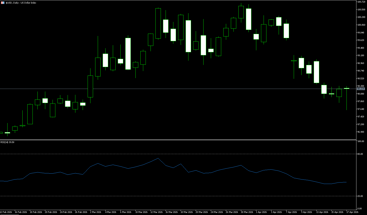 Các đặc điểm kỹ thuật cốt lõi của chỉ số đô la Mỹ tuần trước là: ổn định và tích lũy ở mức thấp, động lượng giảm giá yếu đi, và hồi phục yếu. Nhìn chung, nó vẫn nằm trong giai đoạn điều chỉnh trong một xu hướng giảm trung hạn. Giá đã giảm liên tục từ khoảng 99.00 trong tuần, chạm mức thấp 97.80-98.00 vào giữa tuần, trước khi ổn định quanh mức 98.20 vào thứ Sáu. Biểu đồ tuần có khả năng đóng cửa với một cây nến giảm nhỏ có bóng nến dưới, cho thấy sự hỗ trợ mua tại mức 98.00, nhưng đà hồi phục dự kiến sẽ bị hạn chế. Chỉ số tiếp tục giao dịch dưới các đường trung bình động 5, 10 và 20 ngày, và cấu trúc giảm giá trung hạn (từ mức cao 100.64 vào đầu tháng 4) vẫn không đổi. Thị trường đang bị phe bán thống trị. Sau những đợt sụt giảm liên tục, dấu hiệu tạo đáy đầu tiên đã xuất hiện vào tuần trước, nhưng cấu trúc đảo chiều vẫn chưa hình thành. Chỉ báo kỹ thuật RSI đã bật tăng từ vùng quá bán (<30) lên khoảng 40.55, cho thấy động lượng giảm ngắn hạn suy yếu và cần một đợt điều chỉnh. Trong khi đó, biểu đồ histogram của MACD cho thấy sự sụt giảm đáng kể của các thanh màu xanh, và đường nhanh có dấu hiệu quay đầu đi lên, cho thấy áp lực bán giảm bớt. Vì xu hướng tăng trên biểu đồ tuần đã bị phá vỡ với hai tuần giảm liên tiếp, một đợt điều chỉnh trung hạn từ mức cao 100.60 đã được xác nhận. Do đó, về phía giảm, mức đầu tiên cần theo dõi là 97.82 (mức thấp tuần trước), tiếp theo là 97.35 (mức thấp ngày 23 tháng 2), và mức 97.00 (mức tâm lý). Về phía tăng, đường trung bình động đơn giản 200 ngày tại 98.53 nên được xem xét, tiếp theo là 99.00 (mức tâm lý), và sau đó là vùng 99.06 (mức cao tuần trước).